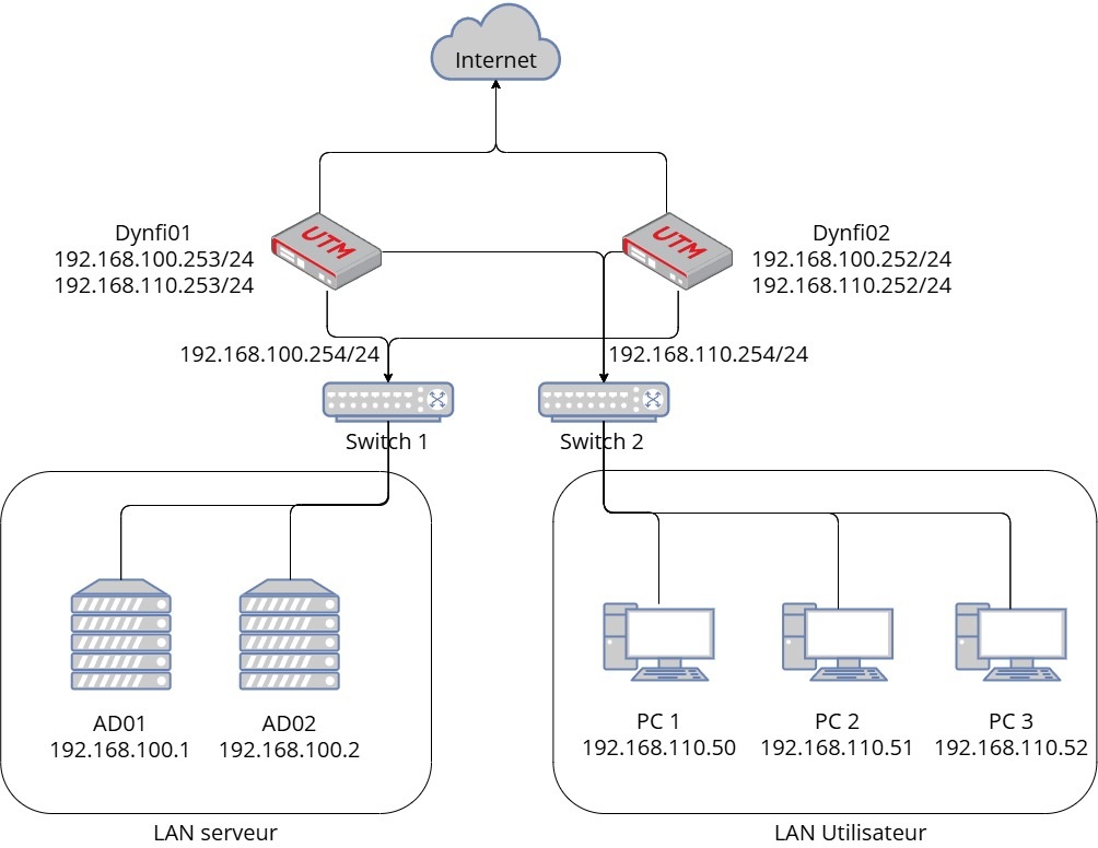 L’objectif principal est de concevoir une infrastructure à la fois sécurisée et résiliente, capable de répondre aux besoins actuels tout en préparant le réseau à des éventuelles évolutions futures. Pour ce faire, quatre axes stratégiques ont été déterminés : la mise en place d’une architecture Active Directory répliquée, l’installation d’un service DNS et DHCP et l’installation d’un pare-feu sur DynFI